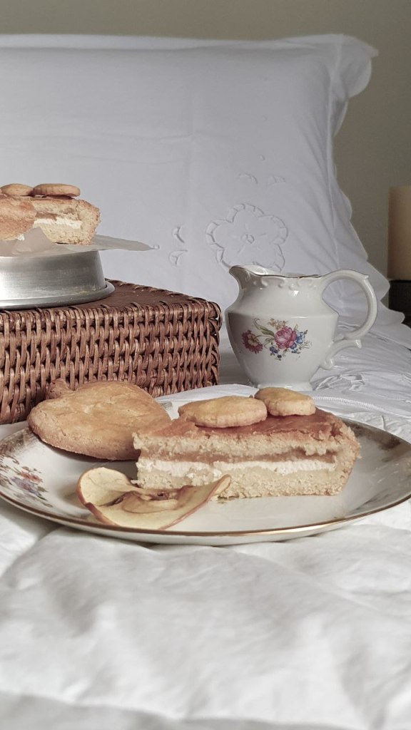 • Stendere il primo disco in teglia, guarnire con crema o cioccolato ( per me apfelmus e robiola senza lattosio ), coprire con il secondo disco, spennellare di uovo, guarnire con pinoli.